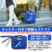 【キャスター付きで移動もラクラク】丈夫なキャスターと伸縮式ハンドルが付いているので、スーツケースのように片手で引くように移動することが可能です。アウトドアやいざという時に女性や年配の方でもラクラク持ち運べます。 重さもわずか26kgと軽量を実現、車に積載する際は積み下ろしも一人で簡単にできるので、日曜大工、出張修理や各種イベントなど、任意の場所に移動して簡単に発電できます。