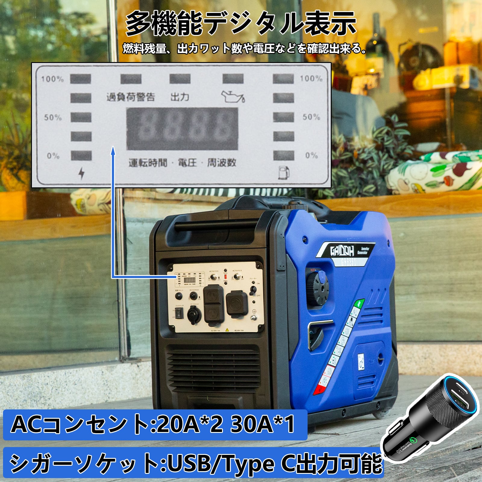 【利便性と視認性を大幅に高める】多機能なデジタルマルチメーターが搭載され、燃料残量、累積使用時間、周波数、出力ワット数や電圧などをすぐ確認できます。正常運転時、過負荷時やオイル不足時の状態もLEDライトで表示、一目で運転状況がわかります。また、点火プラグ、エアクリーナーやオイル注入口のメンテナンスカバーは工具を使用せずにワンタッチで簡単に取り外しができるので、メンテナンスの手間も軽減します。